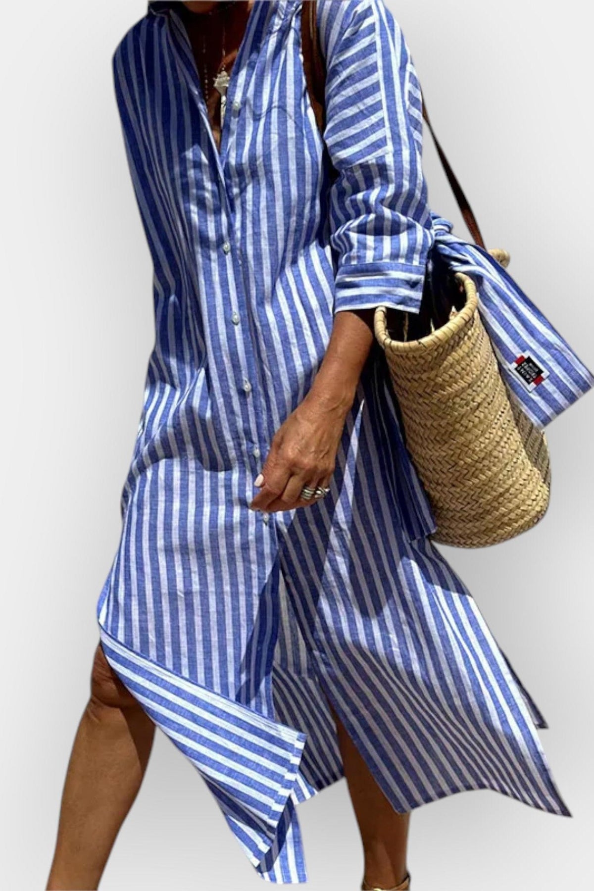 Luna è un abito camicia a righe che unisce un design classico a comfort quotidiano. Il tessuto traspirante e morbido garantisce una sensazione piacevole, mentre la vestibilità rilassata si adatta a diverse forme.