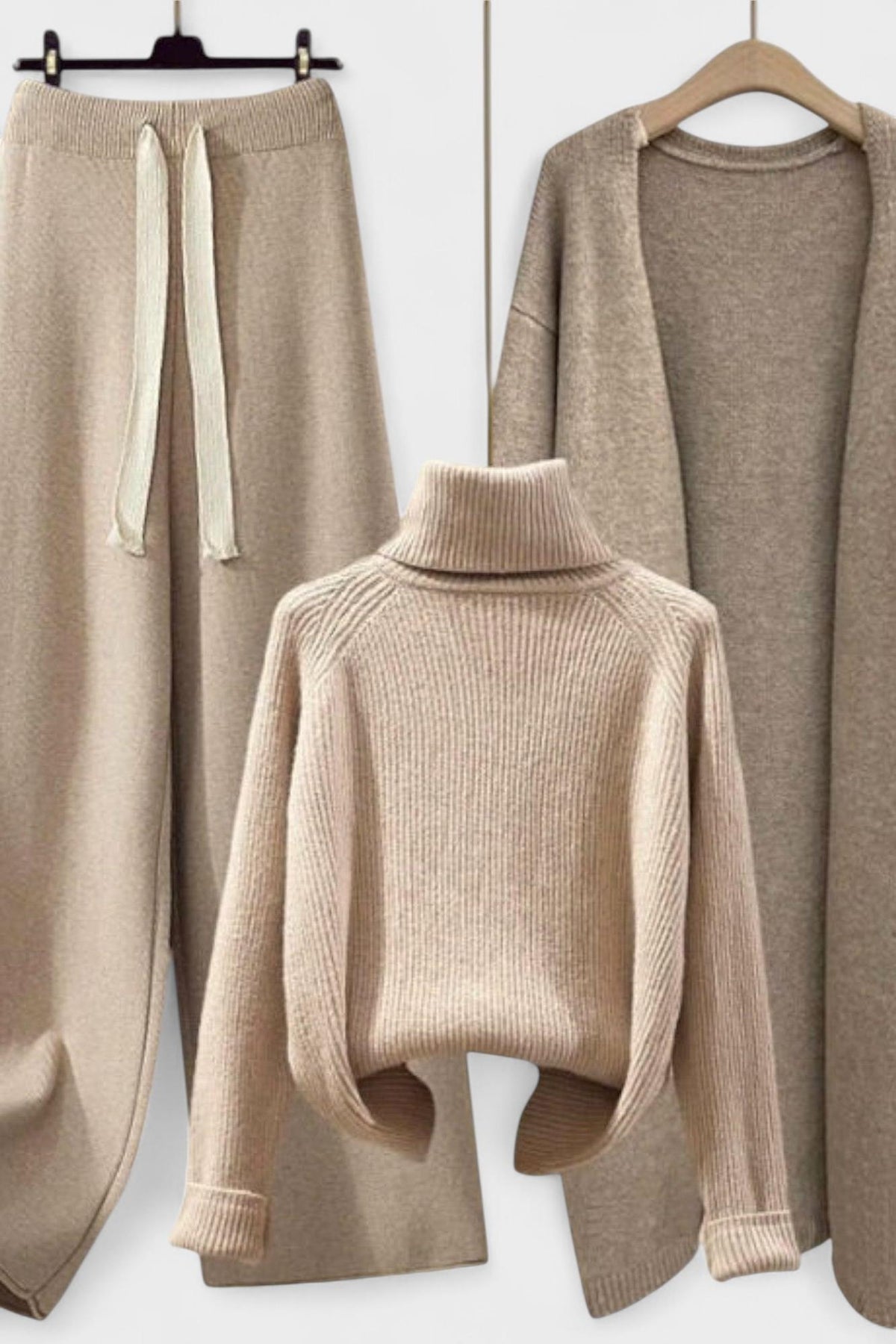 Johanne | Set in maglia rappresenta l'eleganza senza tempo attraverso un'accurata lavorazione artigianale e materiali accuratamente selezionati. Il set è composto da pantaloni larghi con vita regolabile, un maglione a collo alto e un lungo cappotto, progettati per le giornate fresche, dove sostanza incontra stile. Il morbido e caldo materiale in maglia e la vestibilità impeccabile creano un'espressione sofisticata, adatta per la casa, il lavoro o le uscite. L'interazione tra tradizione ed eleganza moderna rende Johanne un investimento nel guardaroba con lunga durata e versatilità.