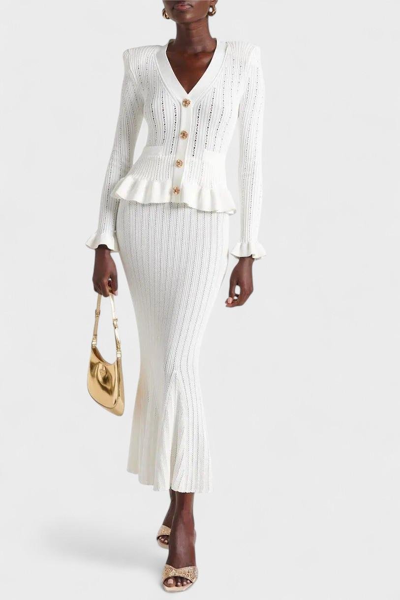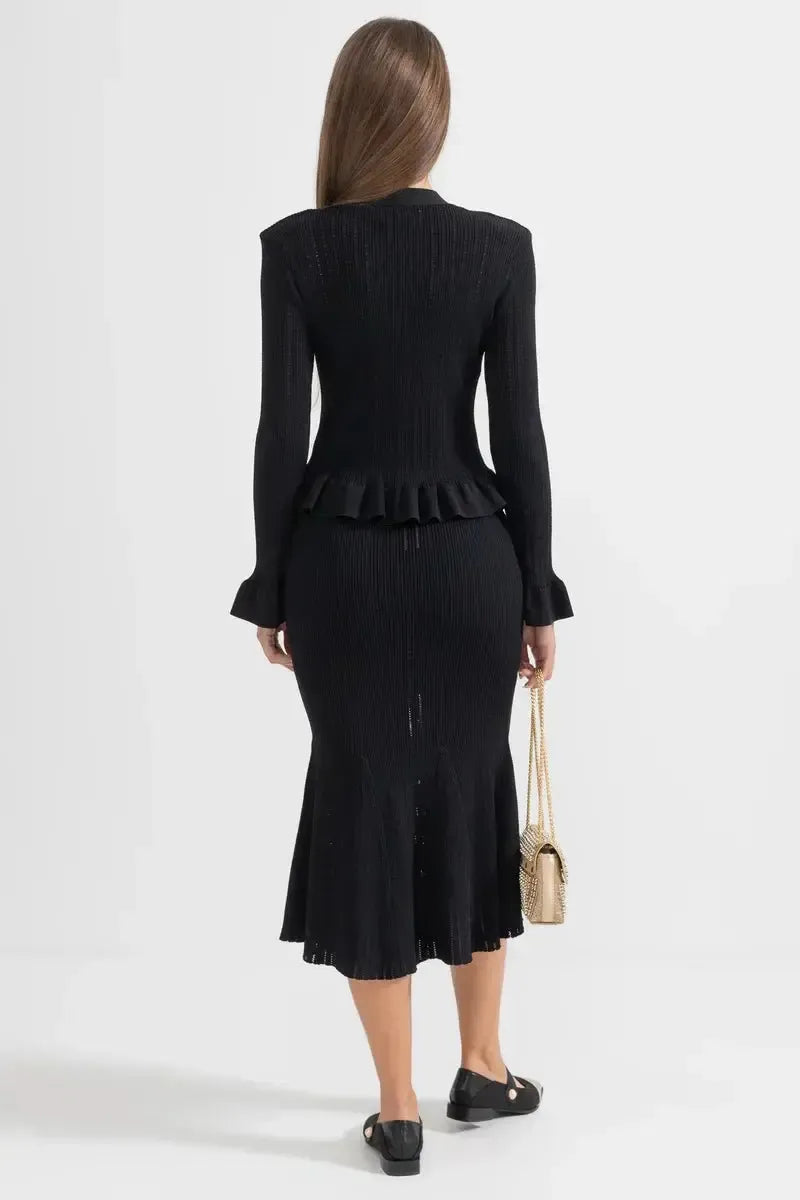 Prudence | Set emana un'eleganza senza tempo e l'orgogliosa eredità del marchio in ogni cucitura. Il set è composto da un cardigan aderente a V con delicati volant alle maniche e bottoni ispirati al vintage, insieme a una gonna midi a linea A con vita alta, tutto realizzato in filati di prima qualità e rifinito con cuciture meticolose. La costruzione morbida e traspirante offre comfort per tutto il giorno, mentre i dettagli ben pensati e il taglio elegante garantiscono una silhouette sofisticata che passa facilmente da un look casual a uno formale. Con disponibilità limitata, Prudence | Set offre un vero fascino da collezionista e un investimento senza tempo nel guardaroba che dura anno dopo anno. La vita alta e il taglio a linea A creano una silhouette senza tempo e lusinghiera che resiste nel tempo.