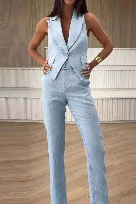 Inger | Set è un omaggio all'artigianato senza compromessi e all'eleganza senza tempo. L'outfit combina un gilet senza maniche e pantaloni stretti, creando una silhouette slanciata e dritta con un tocco moderno, che ti accompagna dalla sala riunioni all'evento serale. Il tessuto leggero e senza pieghe garantisce un comfort piacevole per tutto il giorno, mentre il taglio dritto e affilato allunga la figura e conferisce un'espressione raffinata. Disponibile in beige, rosa pallido e azzurro polvere, Inger | Set esprime personalità senza compromettere una costruzione pulita. Disponibile in un numero limitato presso selezionati rivenditori, Inger è la prova di un vero artigianato e di un'eredità – un investimento in eleganza senza tempo e fiducia in ogni occasione.
